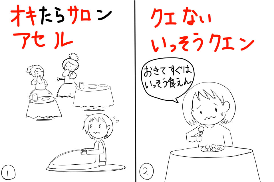 起床すぐなので、食事が「食えない」、朝一なので「いっそう食えん」です。