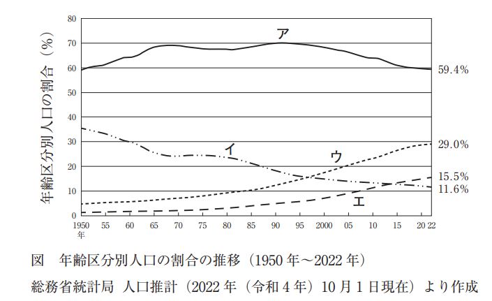 ・下図の曲線ア~エは、15歳未満、15~64歳、65歳以上、75歳以上のいずれか