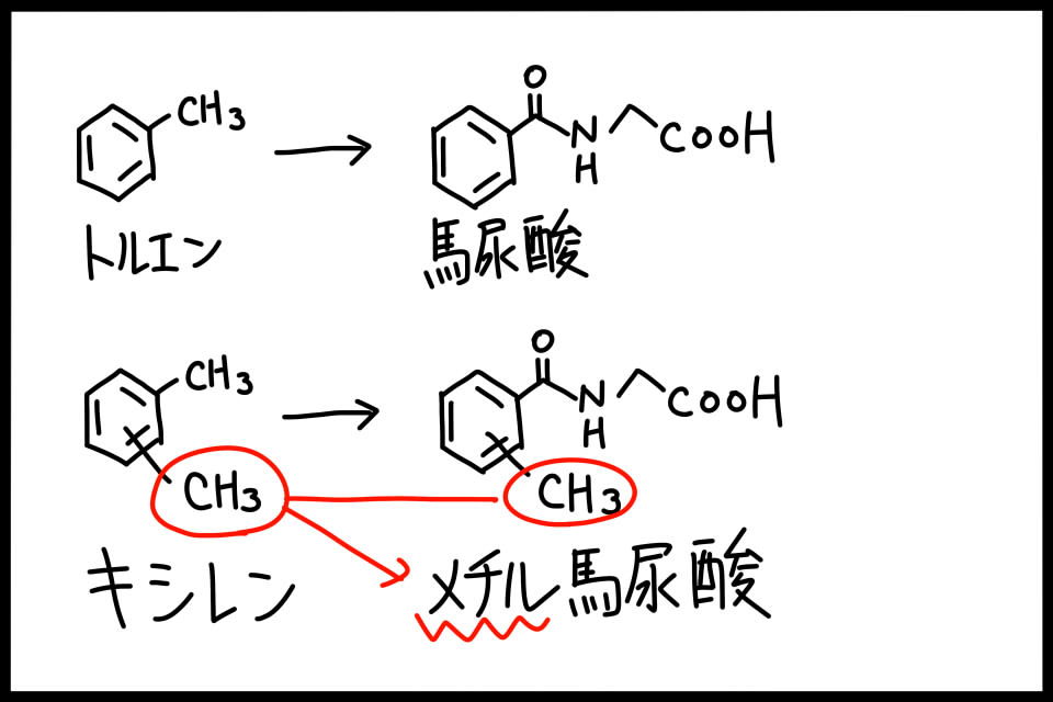 そう、キシレンのバイオマーカーはメチル馬尿酸です。